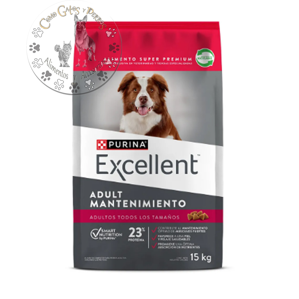 PURINA® EXCELLENT® MAINTENANCE FORMULA ofrece una fórmula completa que incluye tocoferoles mezclados fuente de vitamina E, sin colorantes ni saborizantes artificiales, aportando un óptimo balance nutricional y permitiendo el mantenimiento de una condición corporal ideal para perros de todos los tamaños.
